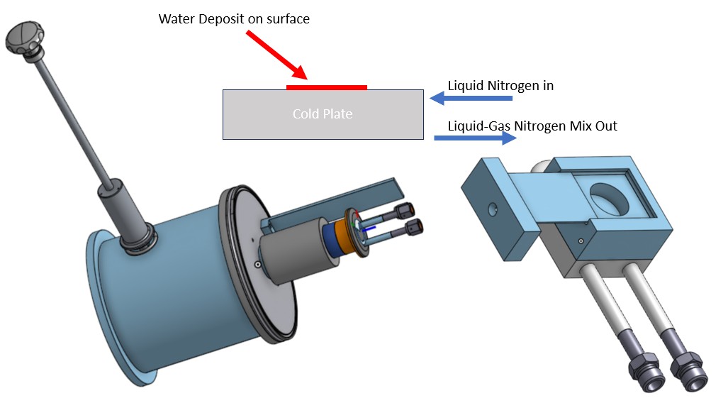 Design vacuum chamber experiment to measure spectral properties of ice/regolith mixtures in UV and VNIR.